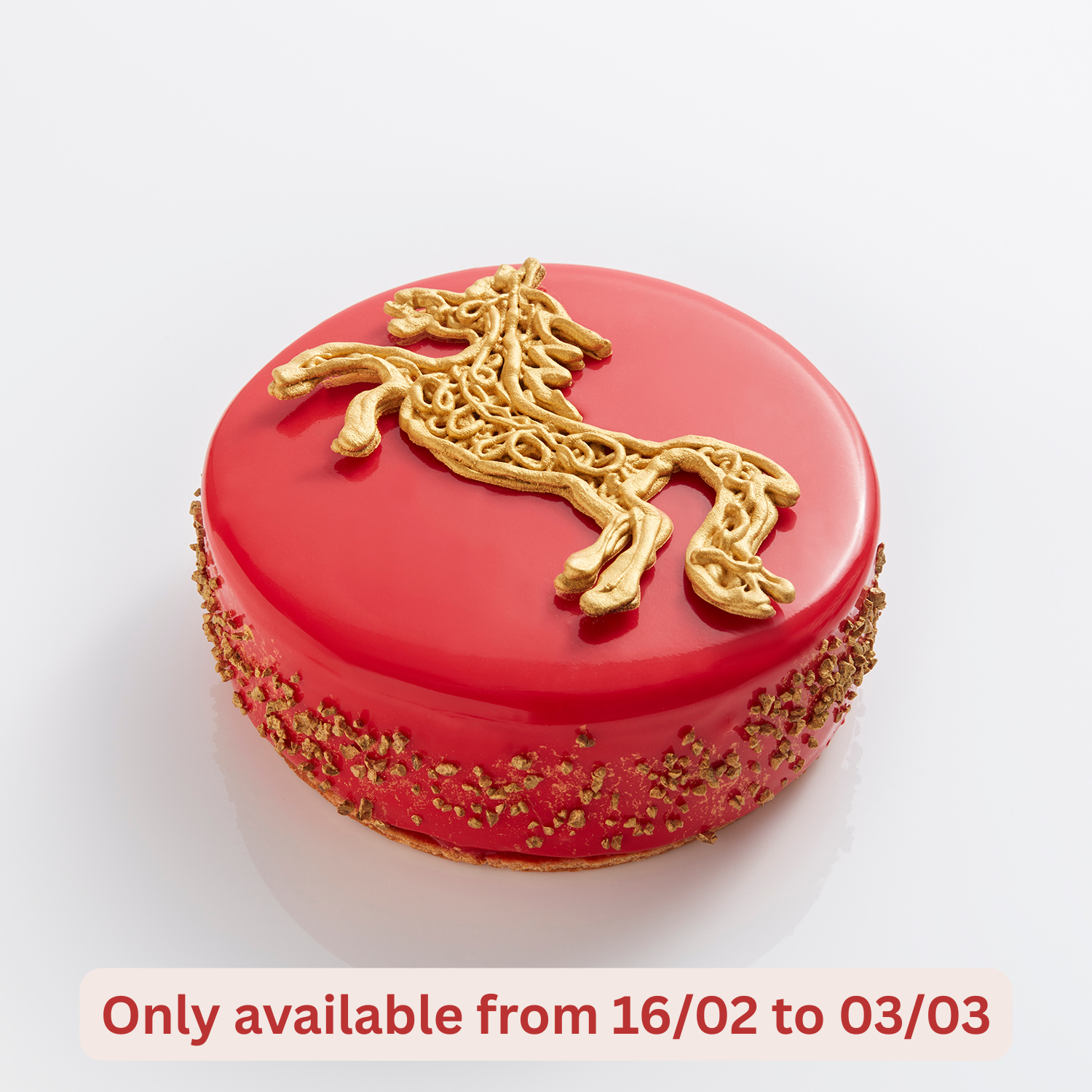 - Golden chocolate horse: A sculpted horse made of fine chocolate, coated in shimmering edible gold, sits proudly on top. It brings movement, elegance, and a celebratory nod to Lunar New Year symbolism.