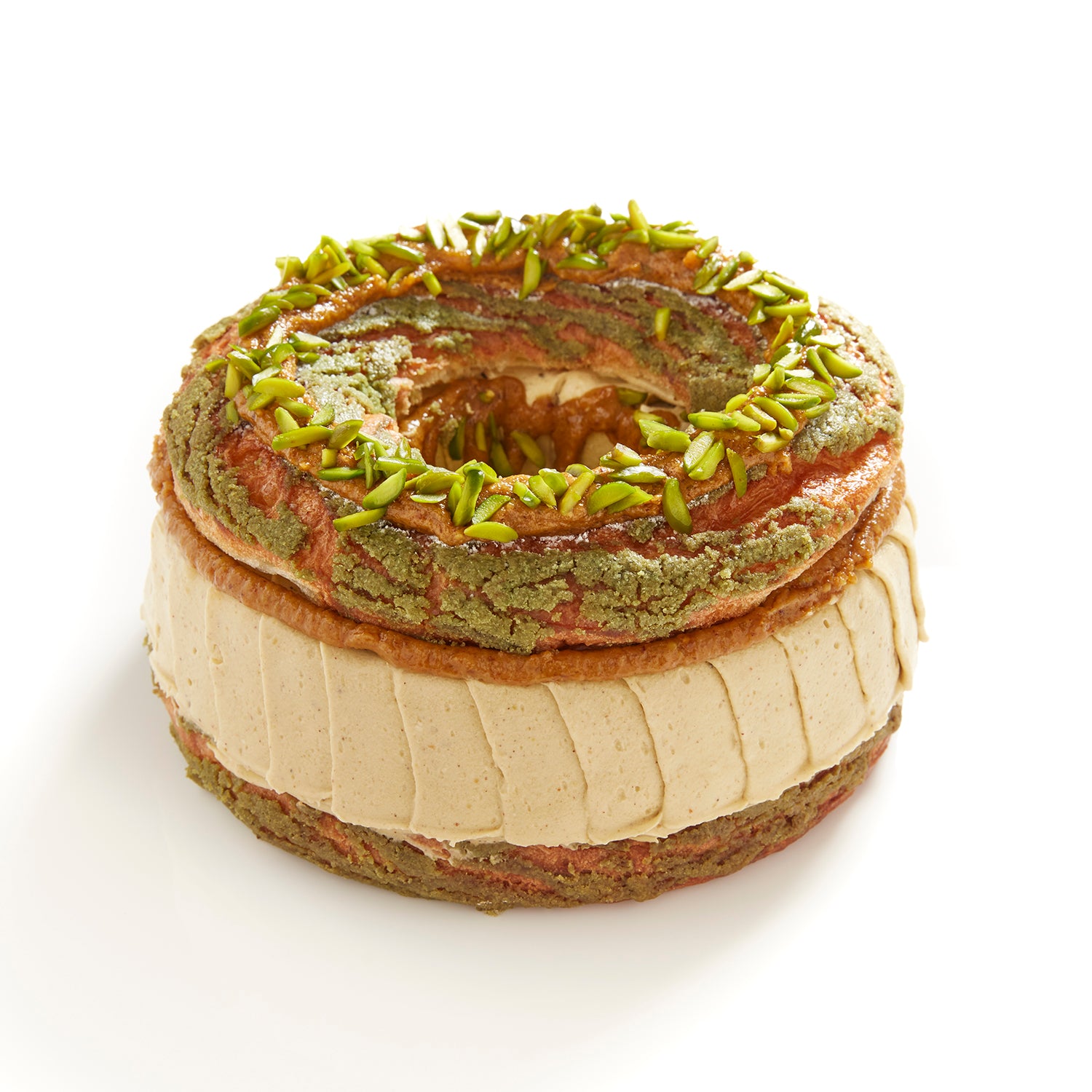 - A soft/heavy pistachio mousseline cream is the main part of the texture.